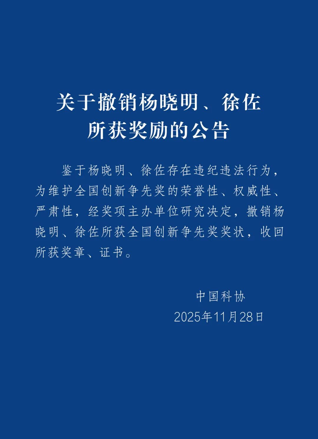 《中国科协之声》11月28日发布《关于撤销杨晓明、徐佐所获奖项的公告》。公告显示,鉴于杨晓明、...