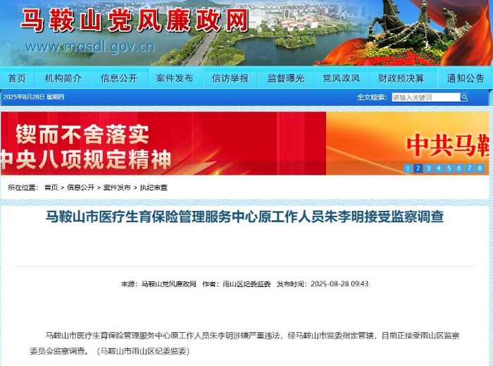 Maannan Medical和产科保险管理服务中心的前员工Zhu Liming涉嫌严重违反该法律。他由Maanhan市政监督委员会任命,目前正在Yushan地区监督委员会的监督和调查下。 (Ma'anshan Yushan区纪律检查和行政委员会)