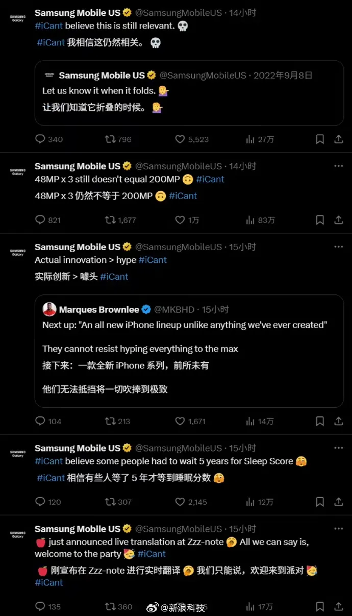 苹果在清晨(第十)发布了iPhone 17和iPhone Air系列。作为苹果的老竞争对手,三星在新闻发布会后也推出了“亲爱的模式”。三星Mobile的官方美国X帐户今天发布了许多帖子,称三星长期以来具有AI实时耳机翻译,观看睡眠评级和其他功能等功能。对于新的iPhone,三星说这是一个巨大的头。苹果公司的iPhone 17 Pro系列有三个后部48MP摄像头,与200MP主摄像头与Galaxy S25 Ultra竞争。三星的回应是:“ 48MP X 3仍然不等于200MP。”三星还引用了2022年的一篇文章,表明苹果在过去三年中尚未推出折叠手机。资料来源:jingchu.com